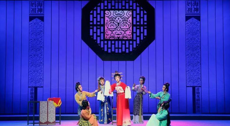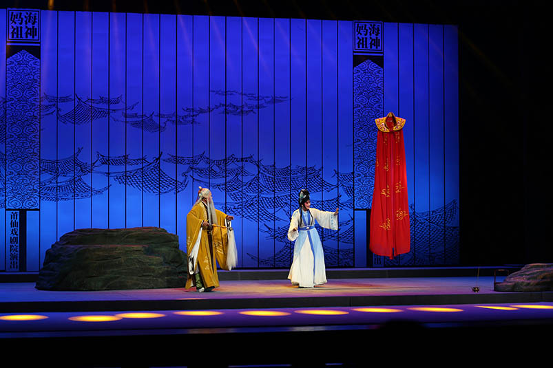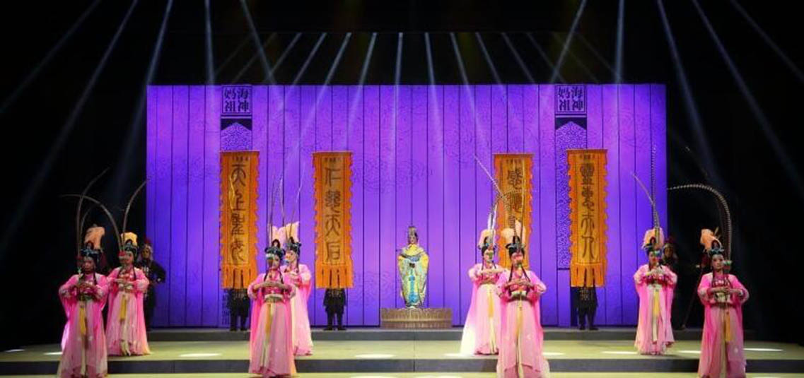 莆仙戲《海神媽祖》主要描述的是林默娘痛心海難無情而無私救苦救難,深得上天感動,最終被授予遇災警示及造福于民的法力,從平凡漁家女子到海上女神的傳奇。劇目以敘事詩般的藝術手法刻畫出媽祖娘娘扶危濟困的偉大形象,靈活展示了媽祖娘娘德、行善、大愛”的精神。隨著海上貿易和文化交流的延伸,媽祖信俗從沿海各地傳播到東南亞乃至全世界,媽祖也因此成為了“海上絲綢之路保護神”。
