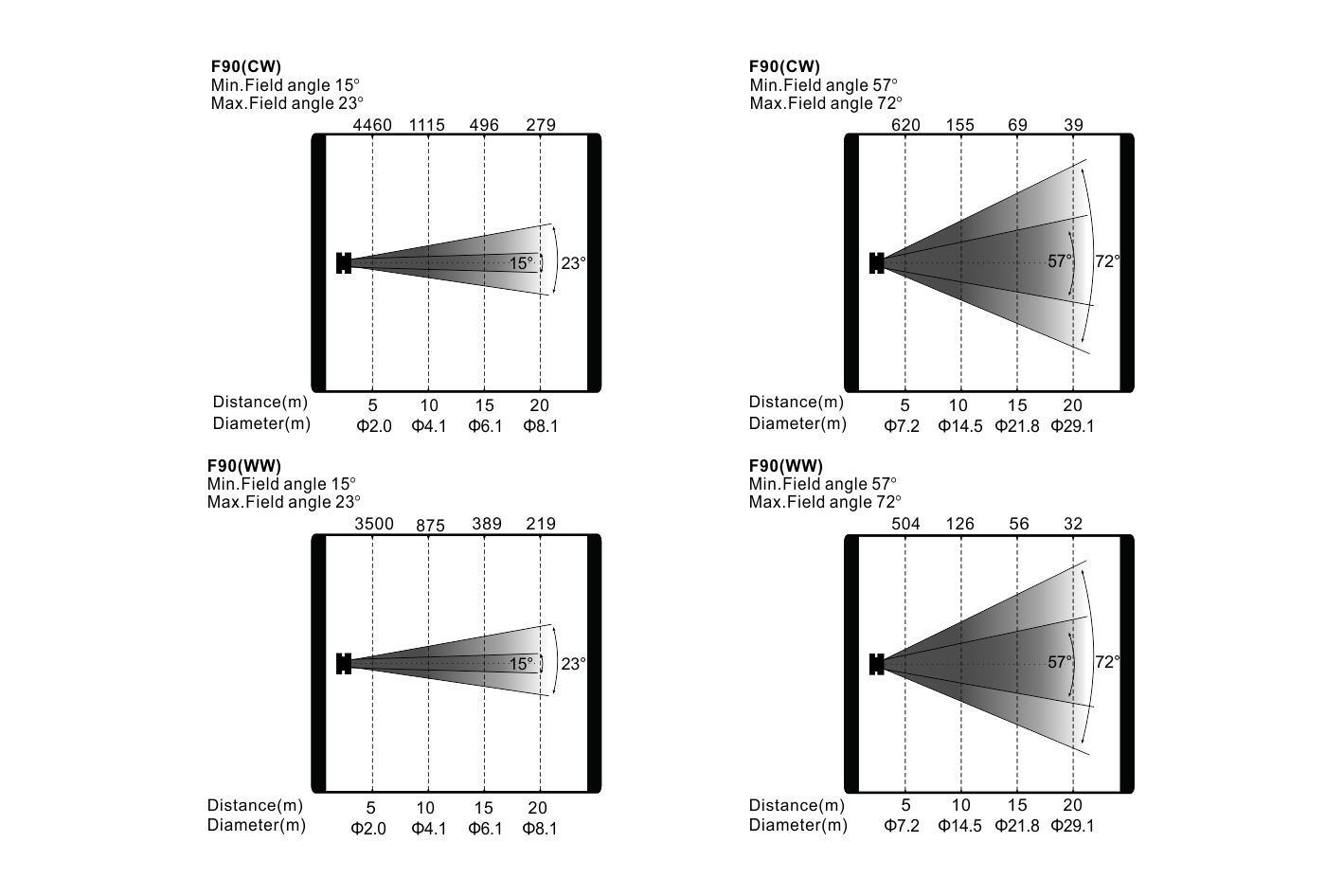 放大:光束角:15°-57°,光斑角:23°-72°,4倍電動線性變焦